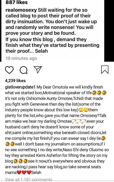 In reaction, Gist Lover Blog threatened to release more incriminating evidence about other affairs Omotola Jalade is having outside her marriage.