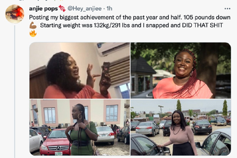 A lady identified as Anjie Pops recently took to her social media handle to share photos of the massive transformation her body has undergone within one and a half year.