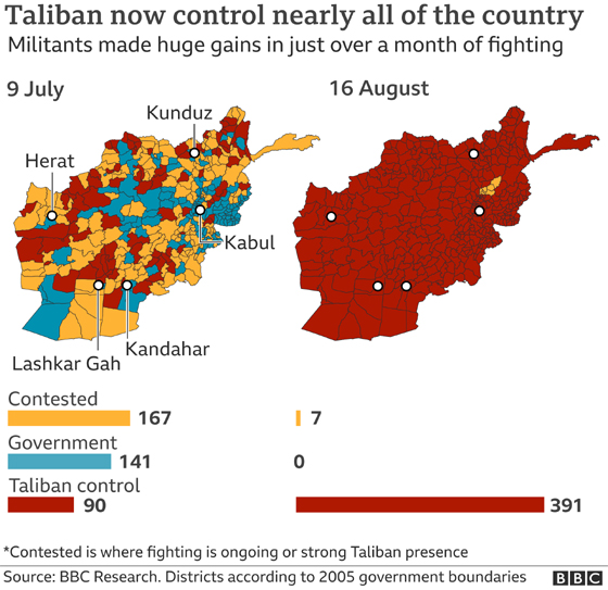 The militants’ return to rule brings an end to almost 20 years of a US-led coalition’s presence in the country.