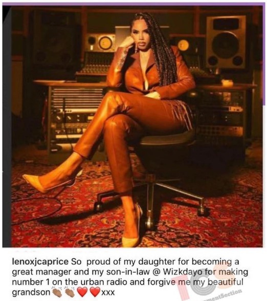 “So proud of my daughter for becoming a great manager and my son-in-law @wizkidayo for making number one on the Urban radio and forgive me, my beautiful grandson,” he wrote.