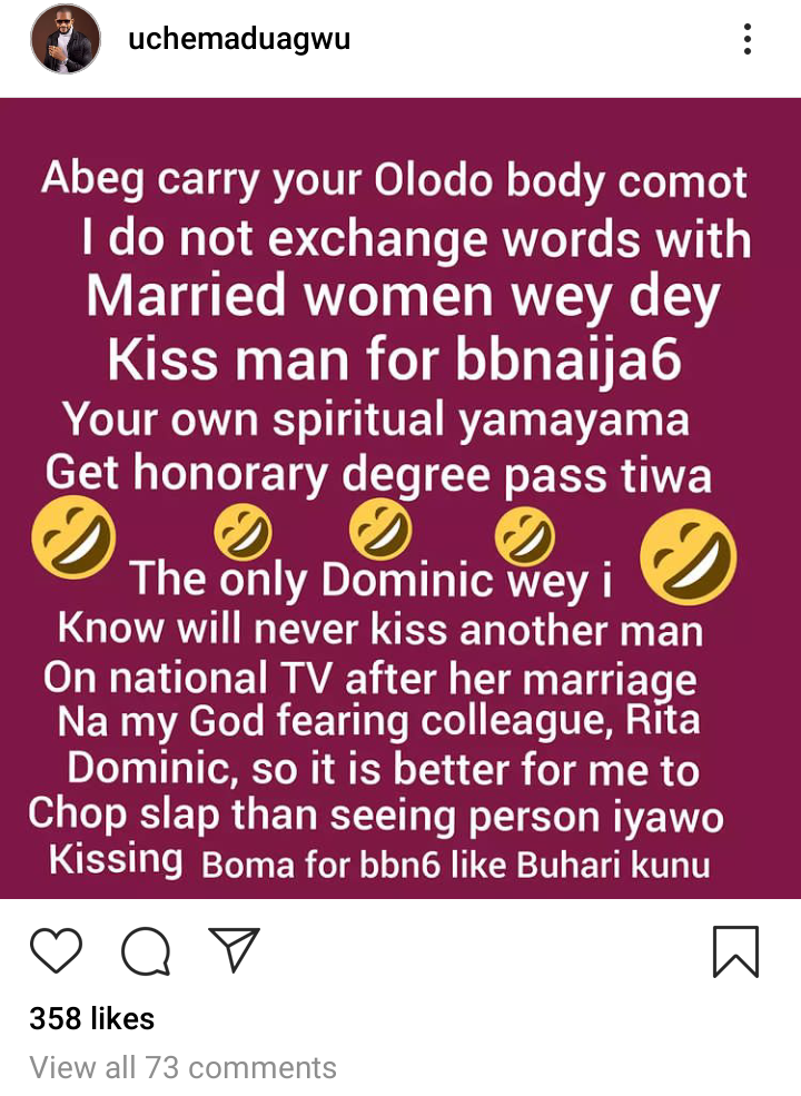 However, while reacting to her comments, Uche Maduagwu has stated that he doesn’t exchange words with married women who cheat in the house with another man.
