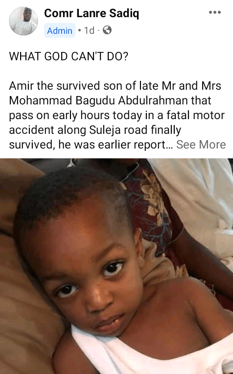 “WHAT GOD CAN’T DO? Amir the survived son of late Mr. and Mrs. Mohammad Bagudu Abdulrahman that passed on in early hours today in a fatal motor accident along Suleja road finally survived.