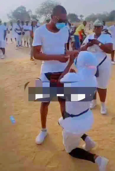 A viral footage has revealed the moment a female corps member is proposing to her boyfriend while they were in an NYSC orientation camp.