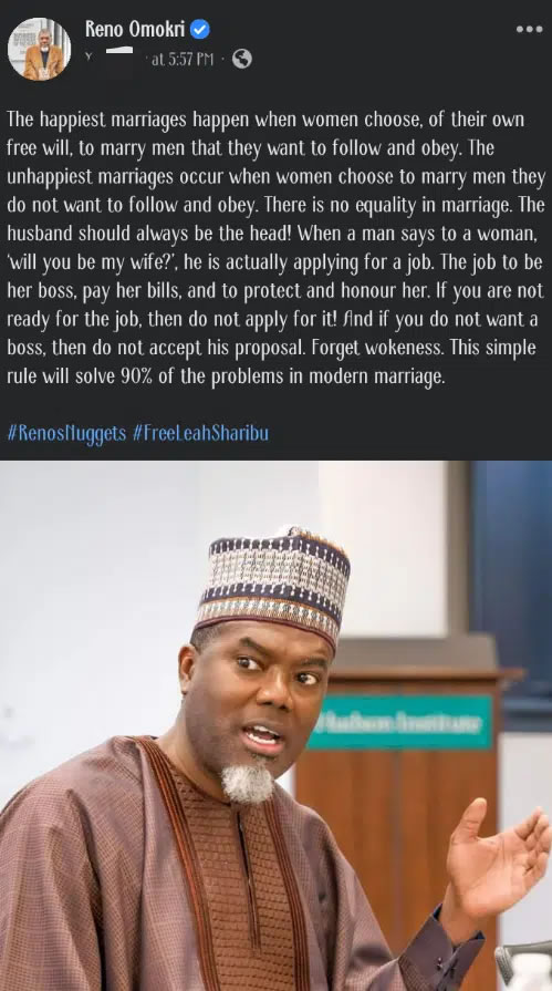 Nigerian author and social media influencer, Reno Omokri, has revealed that there is no equality in marriage.
