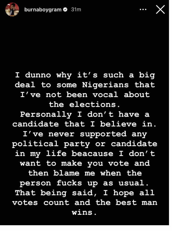 Grammy award-winning singer, Burna Boy, breaks silence on why he has been silent on the ongoing 2023 presidential elections.