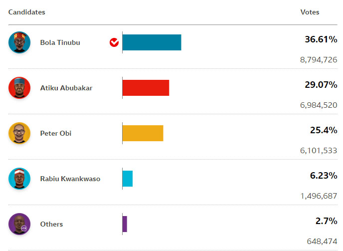 Bola Tinubu of the ruling APC party was declared the winner, with 37% of the vote.
