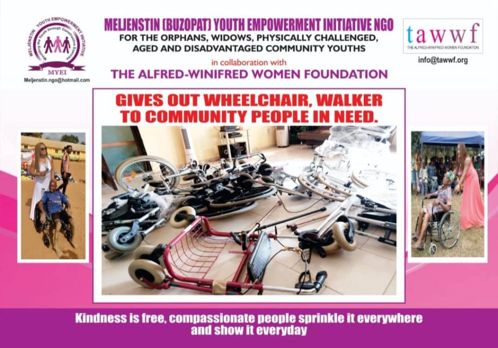 Meljenstin (Buzopat) Empowerment Initiative NGO with Alfred-Winifred Women Foundation gives wheelchairs to victims for Buzopat’s birthday