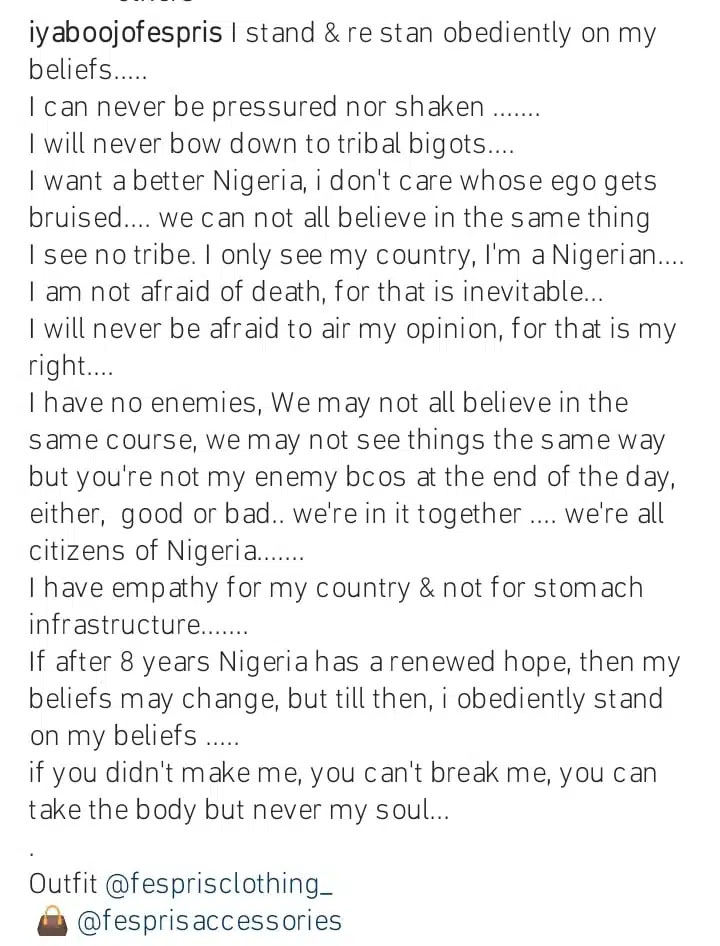 “I stand & re stan obediently on my beliefs. I can never be pressured or shaken. I will never bow down to tribal bigots… I want a better Nigeria, I don’t care whose ego gets bruised. We can not all believe in the same thing. I see no tr!be. I only see my country. I’m a Nigerian… I am not afraid of death, for that is inevitable. I will never be afraid to air my opinion, for that is my right…