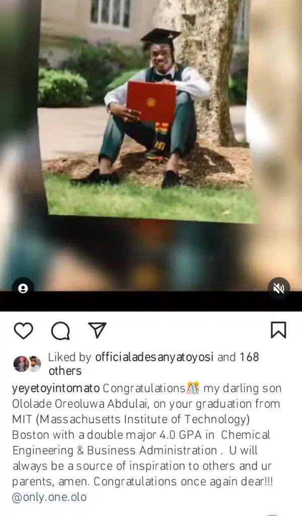 “Congratulations my darling son Ololade Oreoluwa Abdulai, on your graduation from MIT (Massachusetts Institute of Technology) Boston with a double major 4.0 GPA in Chemical Engineering & Business Administration,” Toyin Tomato joyfully shared.