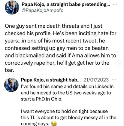 He wrote on Twitter: “One guy sent me death threats and I just checked his profile. He’s been inciting hate for years…in one of his most recent tweet, he confessed setting up gay men to be beaten and blackmailed and said if Ama allows him to correctively rape her, he’ll get her to the bar.