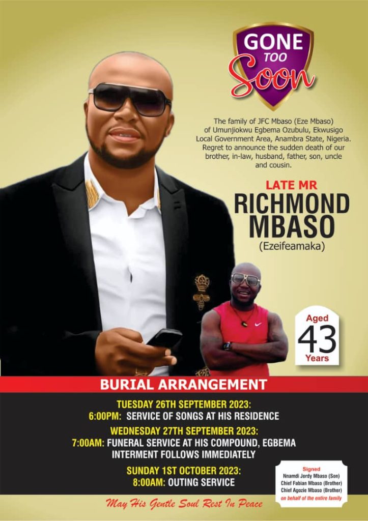 “Ezeifeamaka, as fondly called, will be buried on the 27th of September, 2023. Whatever happened to you remained a mystery, but if God did not allow it, you would still be here with us; he was a jolly good fellow with an amiable personality, and a good example of ‘Odogwu Nwoke.” Keep resting in peace and power!!!